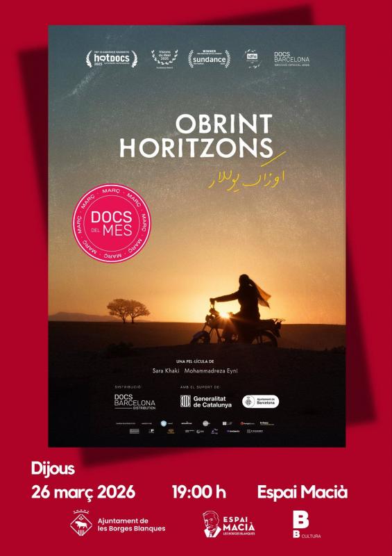 Aquest dijous, 26 de març de 2026, l’Espai Macià de les Borges Blanques projecta el documental Obrint horitzons (2025) de Sara Khaki i Mohammadreza Eyni. El documental explica la història de la primera dona elegida com a regidora al seu poble, i com ensenya a les nenes a conduir motocicletes i lluita contra els matrimonis infantils. El documental ha estat seleccionat als festivals DocsBarcelona i Sundance en les seves seccions competitives, i ha estat premiat al Visions du Réel amb el premi del públic (2025). La projecció tindrà lloc a les 19 h a la sala d’actes de l’Espai Macià i té una durada de 95 minuts.