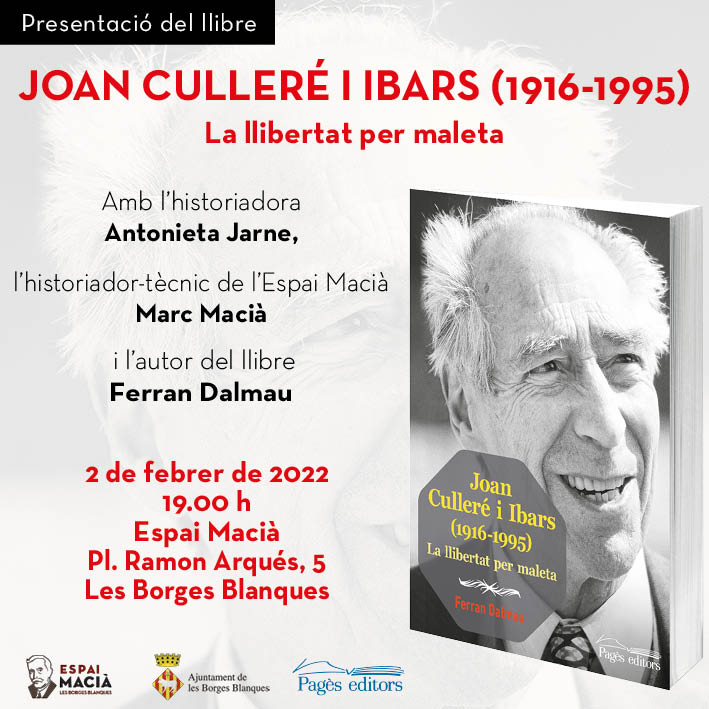 El proper dimecres 2 de febrer l’Espai Macià de les Borges Blanques acollirà la presentació del llibre Joan Culleré i Ibars (1916-1995). La llibertat per maleta, de Ferran Dalmau, editat per Pagès editors. El llibre repassa la trajectòria d’un independentista de primera hora que visqué la proclamació de la República, els Fets d’octubre de 1934, la Guerra Civil, els camps de concentració i l’exili, i que lluità en la resistència antifranquista des del Front Nacional de Catalunya, del qual en fou delegat a l’Assemblea de Catalunya. La presentació tindrà lloc a les 19.00 h a la segona planta de l’Espai Macià i comptarà amb la presència de l’autor, Ferran Dalmau; la historiadora Antonieta Jarne; i l’historiador-tècnic de l’Espai Macià, Marc Macià Farré.