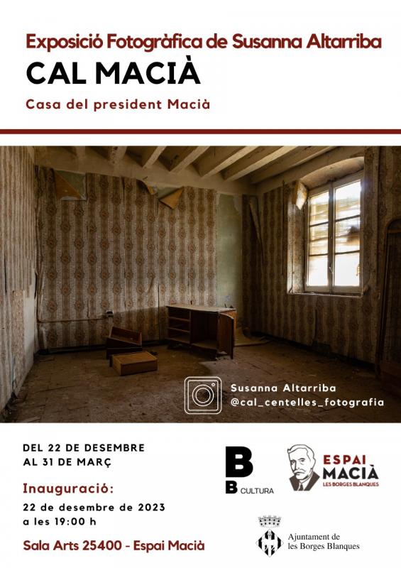 Aquest divendres 22 de desembre, l’Espai Macià inaugurarà l’exposició “Cal Macià”, un projecte fotogràfic de Susanna Altarriba. La mostra explora mitjançant 19 fotografies la darrera casa particular que queda en peus on va viure el president Macià i la seva família. Segons la fotògrafa, “aquest projecte l’he creat en honor a la nostra memòria històrica i pels nostres descendents”, amb la voluntat de promoure el reconeixement patrimonial de l’immoble i la recuperació de l’edifici per part de les institucions públiques. L’autora explica que “les parets d’aquesta casa, tot i el seu estat, coneixen de primera mà la nostra història i això és el que he volgut reflectir en les meves fotografies, combinant l’estètica de les imatges amb l’atmosfera del lloc”. L’exposició s’inaugurarà demà divendres 22 de desembre de 2023 a les 19 h i es podrà visitar fins el 31 de març de 2024 a l’Espai Macià de les Borges Blanques.