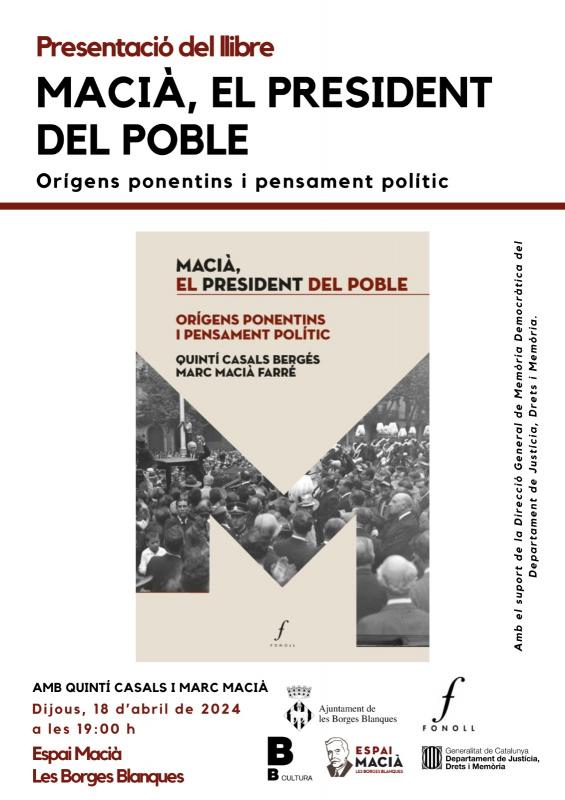 Aquest dijous, l’Espai Macià acollirà la presentació del llibre Macià, el president del poble. Orígens ponentins i pensament polític, de Quintí Casals i Marc Macià. L’acte anirà a càrrec dels autors que volen oferir una nova mirada sobre el personatge, el president més estimat de la història de Catalunya, explorant el seu vincle amb les terres de Ponent, així com la seva passió per la millora de les condicions de vida de la classe treballadora catalana. El llibre és el tercer volum de la col·lecció Espai Macià, impulsada per aquest equipament cultural de les Borges Blanques, que vol difondre estudis d’història vinculats als valors i les idees del president Macià. L’acte tindrà lloc dijous 18 d’abril de 2024 a les 19 h a l’Espai Macià de les Borges Blanques.