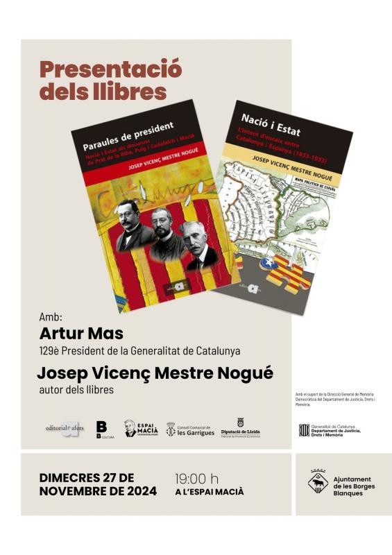 L'Espai Macià de les Borges Blanques acollirà el proper dimecres 27 de novembre a les 19 h la presentació de dos nous llibres de l'historiador Josep Vicenç Mestre Nogué, Paraules de president. Nació i estat als discursos de Prat de la Riba, Puig i Cadafalch i Macià i Nació i Estat. L'intent d'encaix entre Catalunya i Espanya (1833-1923).