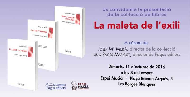 El dia 11 d'octubre a les 20h es farà la presentació de la col·lecció "La maleta de l'exili" a la planta -1 de l'Espai Macià de les Borges Blanques.