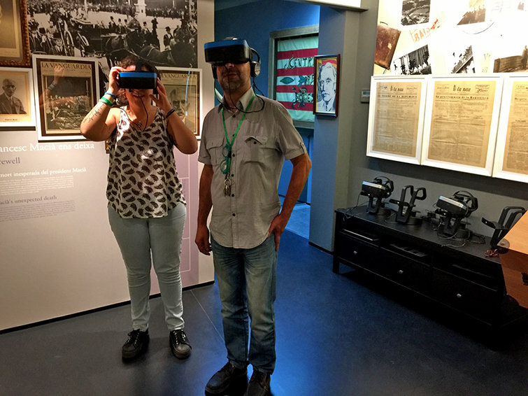 Els tècnics de l'Espai Macià utilitzant les noves ulleres de realitat virtual que permeten recrear la vida del 122è president de Catalunya