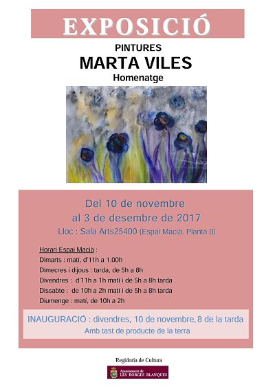 L'exposició de pintures en homenatge a l'artista Marta Viles s'inaugurarà el dia 10 de novembre a les 20 h i es podrà visitar, sempre en l'horari de l'Espai Macià, fins al 3 de desembre. Després de la inauguració hi haurà un petit tast de productes de la terra.